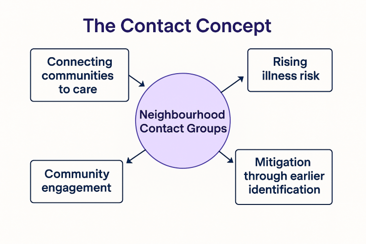 Contact is not another clinical meeting, nor is it a traditional multidisciplinary team (MDT) forum. It does not replace existing health and social care services. Instead, it creates a structured space in which residents, clinicians, care providers, voluntary sector partners, and local leaders come together to share insight, generate coordinated action, and strengthen prevention at neighbourhood level.